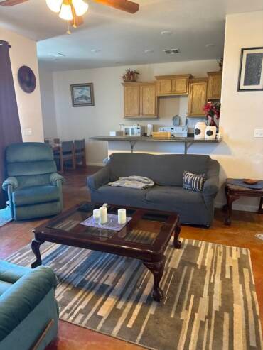 34′ RV with full kitchen and entertainment area. Two private bedrooms and pull-out couch which comfortably sleeps up to six(6) adults.
